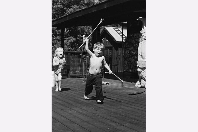 As we drive up the hill to High Trees camp, Jackson excitedly points out a rabbit zigzagging out of our way and into the brush. We head past the Eternal Campground, where earlier in the day we visited the gravemarkers of Sam's mother and my beloved Winston the weimaraner. It's raining, so Sam gets to work building a fire in the woodstove while I light a lantern and get the boys jammied and into their beds. When they were younger, we used to drag all the mattresses onto the floor and make a huge family bed (think